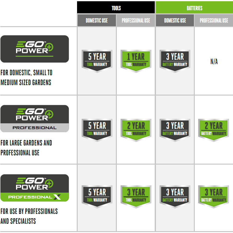 At EGO we pride ourselves on manufacturing products that not only have petrol-matching power, but are reliable and robust too. That’s why all our products are covered by extended warranties that you can rely on.